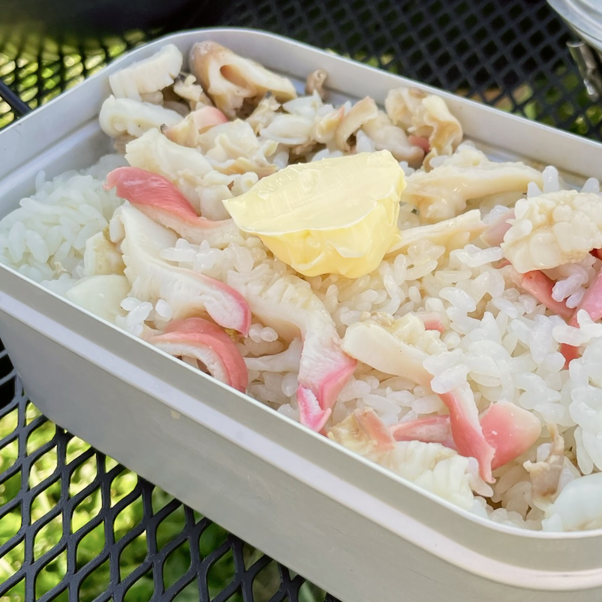 メスティンで炊いたホカホカのご飯にバターと醤油を少し加えるだけでも大満足。地元で採れた貝などを加えて炊き込みご飯にすれば、より美味しくいただけます。